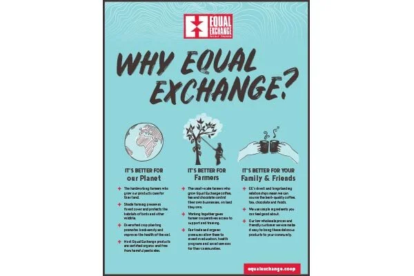 Equal Exchange coffee is better for farmers, better for the environment and better for those who appreciate high-quality, organically grown coffee. Choosing fairly traded, organic coffee has a real and meaningful impact in all three areas. If your members want to promote social justice, environmental sustainability and fair trading relationships, Equal Exchange offers an affordable way to connect your values with your actions without sacrificing taste and quality.
