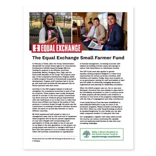 A new Small Farmer Fund has been established to raise $250,000-$500,000 to pay for some of the producers’ programs. Please consider contributing to this effort. When you order Equal Exchange products at equalexchange.coop for your family, you can also make a separate donation to help grow this fund.